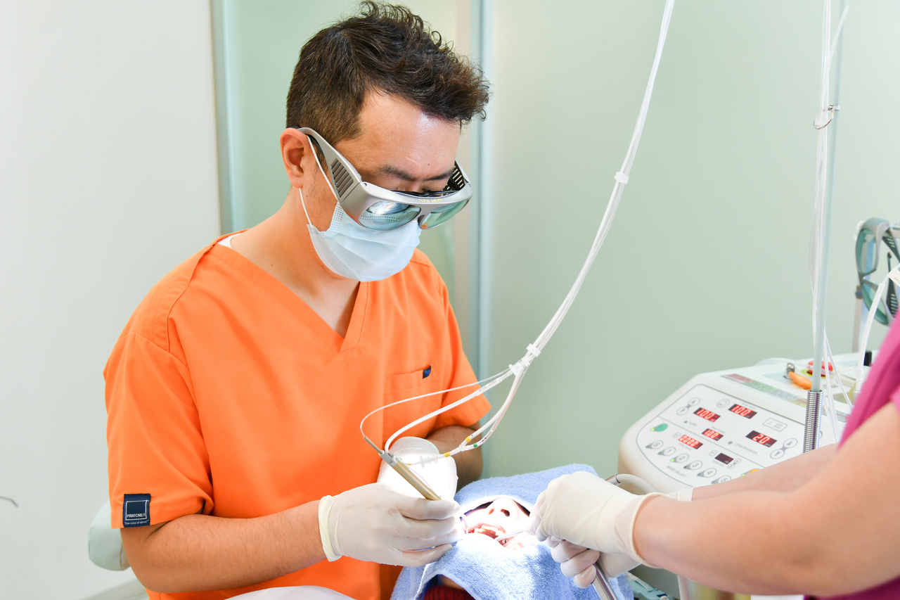 複雑な形の根管(歯の根っこ)をキレイにするのに、人間の手だけではどうしても限界があります。そこで当院はプラズマレーザーを導入。歯の根の中にレーザー光を照射して、虫歯菌の病巣を殺菌する治療を行っています。